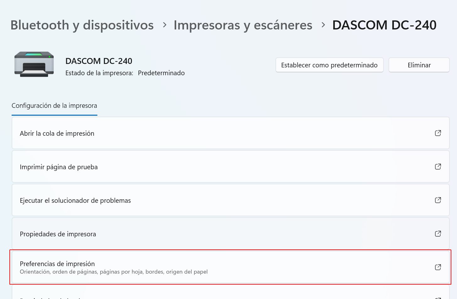 Acceso al Controlador: Abrir el controlador de la impresora DC-2300 y selecciona la opción Preferencias de impresión.